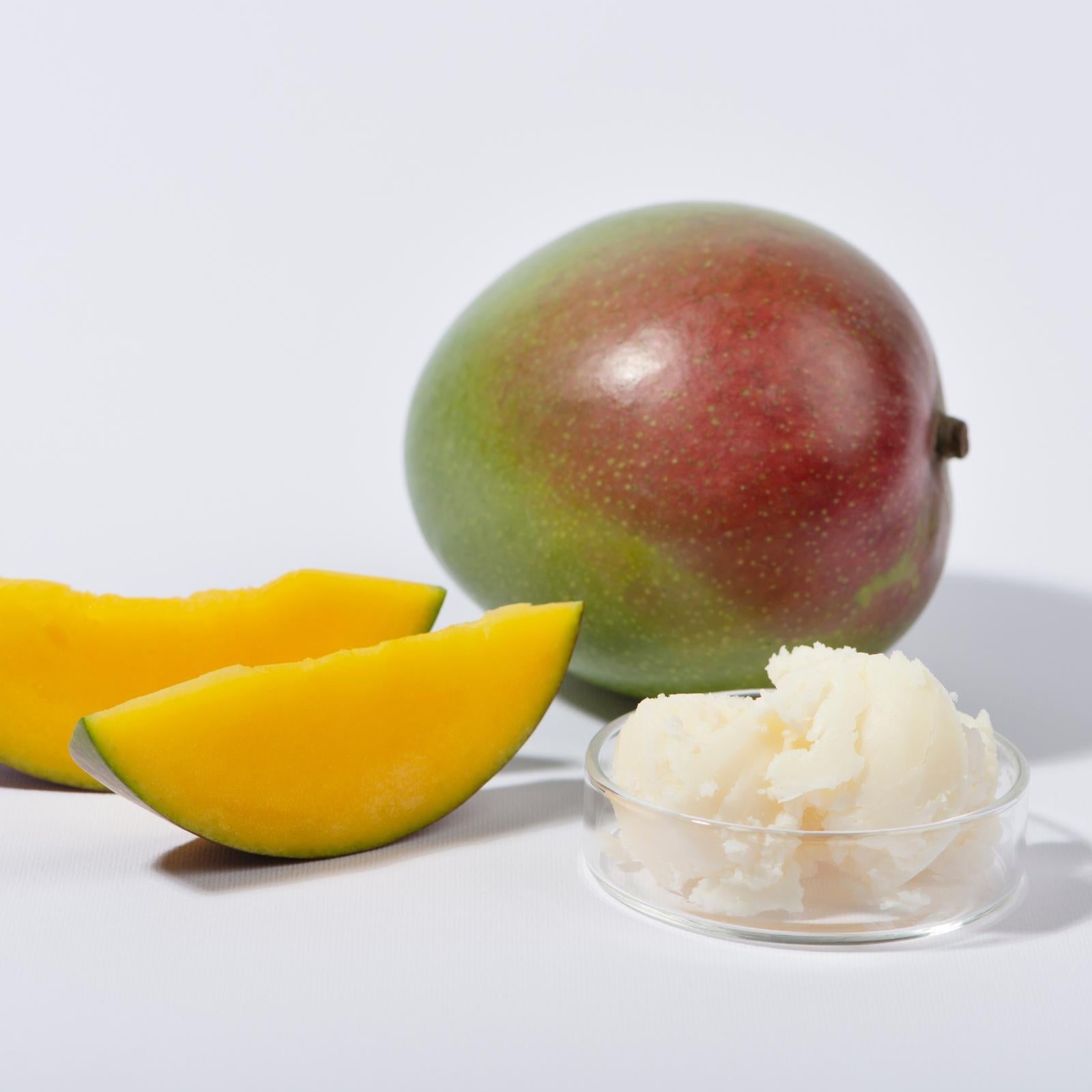 - Mango butter contains vitamin A, C, and E. It is high in antioxidants and serves as an emollient to soften the skin. It helps to prevent inflammation and itching caused by dry skin. It is also a good source of triglycerides.